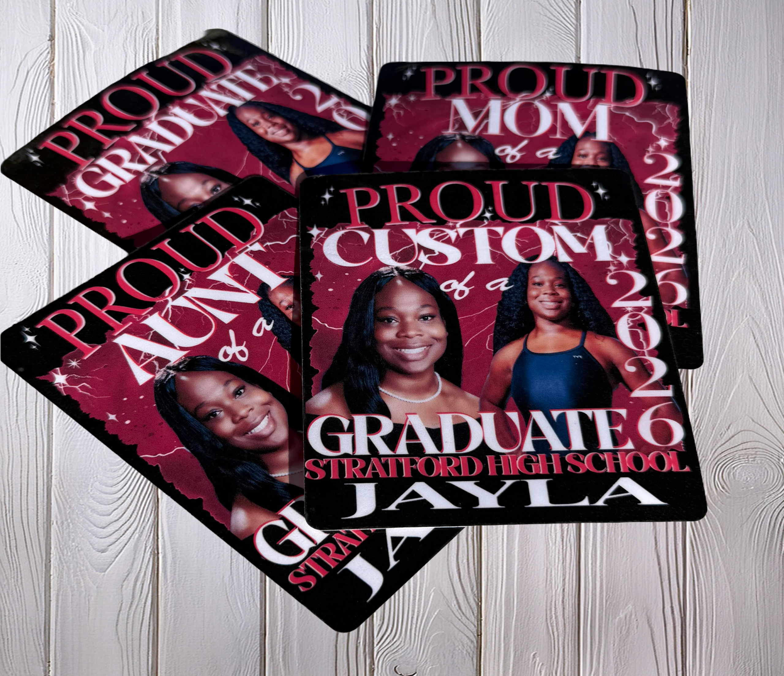 Each sticker is fully customized with your graduate’s photo, relation to graduate, graduate name, high school, and graduation year. Choose from a variety of relationship titles — including Proud Mom, Proud Dad, Proud Step Mom or Dad, Proud Aunt, Proud Grandma, Proud Graduate, and more — so every member of the family can show their support.