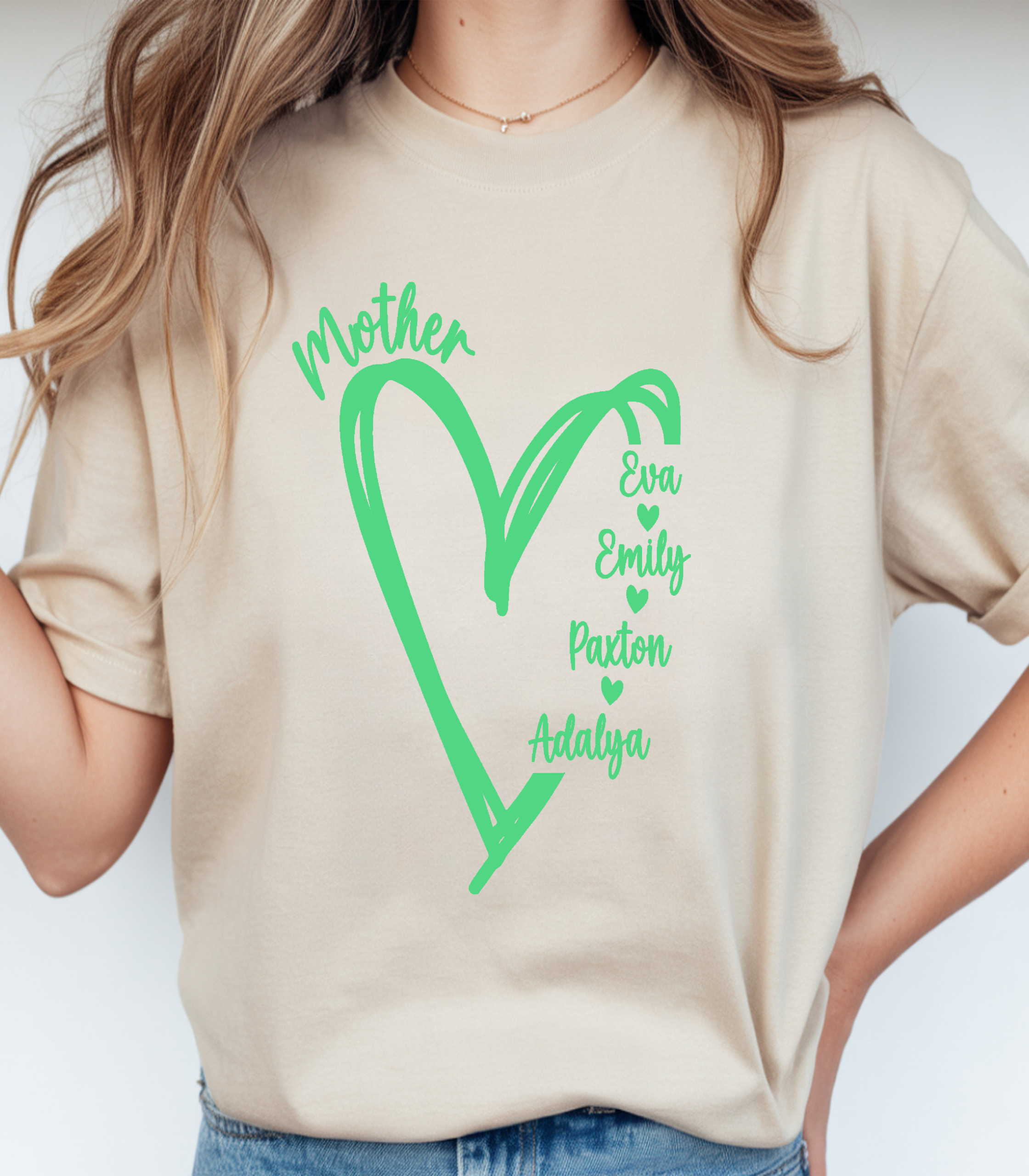 This custom Mother heart t-shirt is more than just a shirt — it’s a wearable reminder of the people she loves most. Designed with a hand-drawn brushstroke heart and her children’s names elegantly listed inside, this piece is equal parts meaningful and stylish.