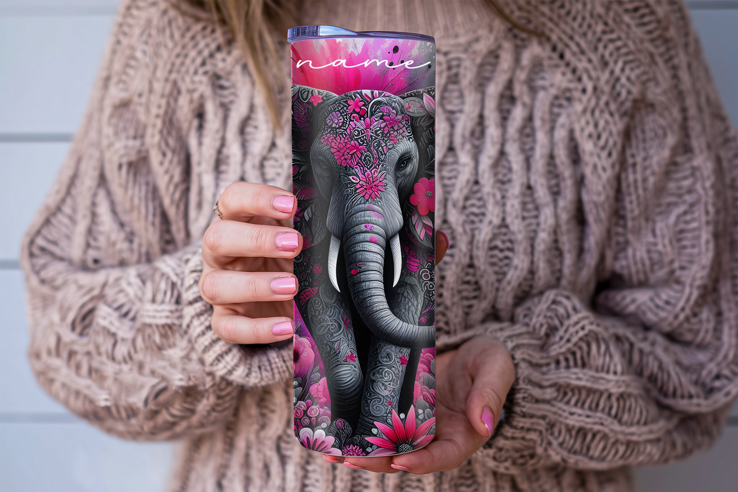 Celebrate strength, beauty, and artistry with this breathtaking 20 oz or 30 oz skinny tumbler featuring an intricate floral elephant design. Rendered in rich shades of pink, magenta, and charcoal gray, this tumbler showcases a stunning combination of bold detail and boho elegance. The customizable name option at the top makes it a perfect personalized gift for anyone who loves unique, meaningful drinkware.