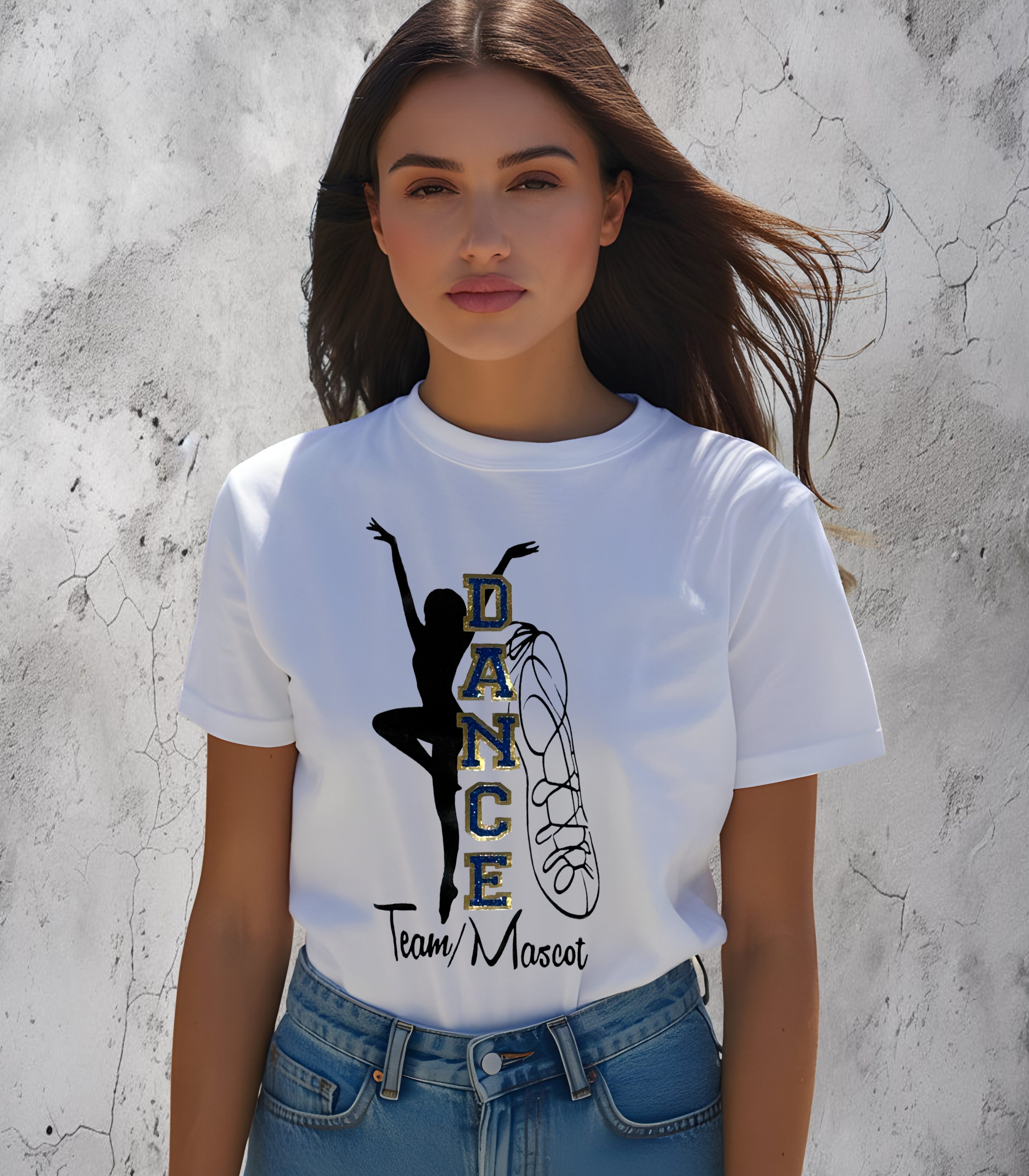 This clean white women’s dance tee features a vertical varsity “DANCE” design in sparkling navy and gold, a sleek black dancer silhouette in full performance pose, and a flowing ribbon graphic — finished with a customizable Team/Mascot line. Perfect for dance moms, dancers, coaches, and studio teams. A stylish, personalized spirit wear essential for recitals, competitions, and everyday dance life.